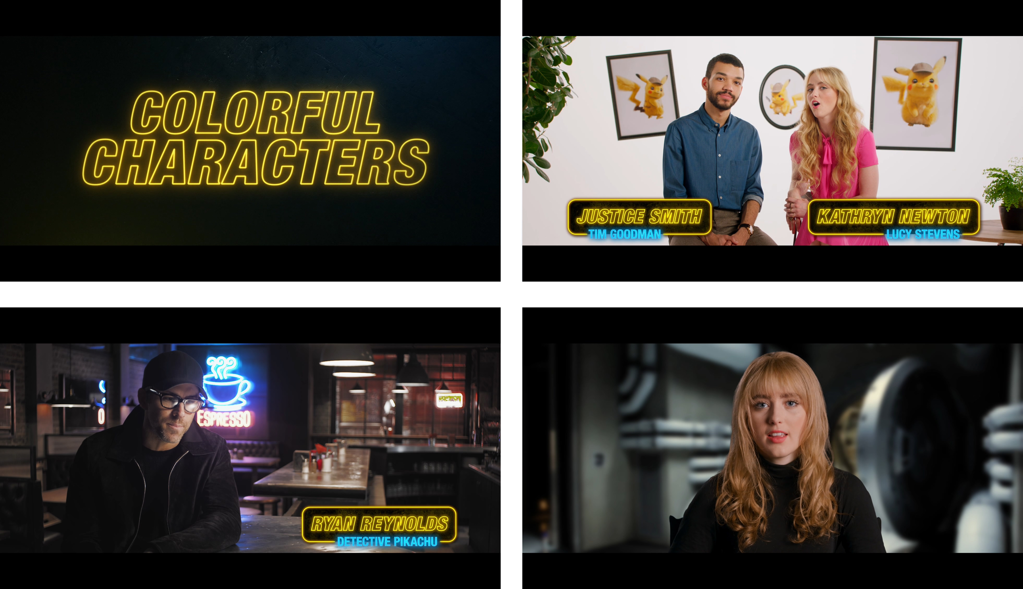 5개의 파트로 나눠진 ‘Creating the World of Detective Pikachu’는 라임시티나 액션, 캐릭터에 이르기까지 영화를 만들어나가는 과정을 보여주는 메이킹 필름이다. 그 중에서도 ‘Colorful Characters’에서는 주인공을 맡은 저스티스 스미스와 캐서린 뉴튼 및 라이언 레이놀즈가 극 중 캐릭터에 대한 설명을 이어가는 내용을 담았다. 특히 라이언 레이놀즈는 자신이 맡은 피카츄에 대해서 말하길 “누가 나를 고열에 튀겨서, 조그만 노란 녀석에게 주입한 듯한 캐릭터’라고 표현한다.