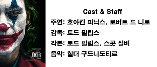 영화 자체로만 보자면 예측 가능한 범위 내에 있는 사이코 범죄 느와르의 플롯을 따라간다. 이런 류의 영화가 이전에도 없고 앞으로도 없을 것이냐고 묻는다면 답은 ‘아니오’다. 영화는 분명 ‘조커’라는 이름과 DC 코믹스의 캐릭터에 기초를 두었다는 점에서 많은 빚을 지고 있다. 그리고 배우 호아킨 피닉스에게도.