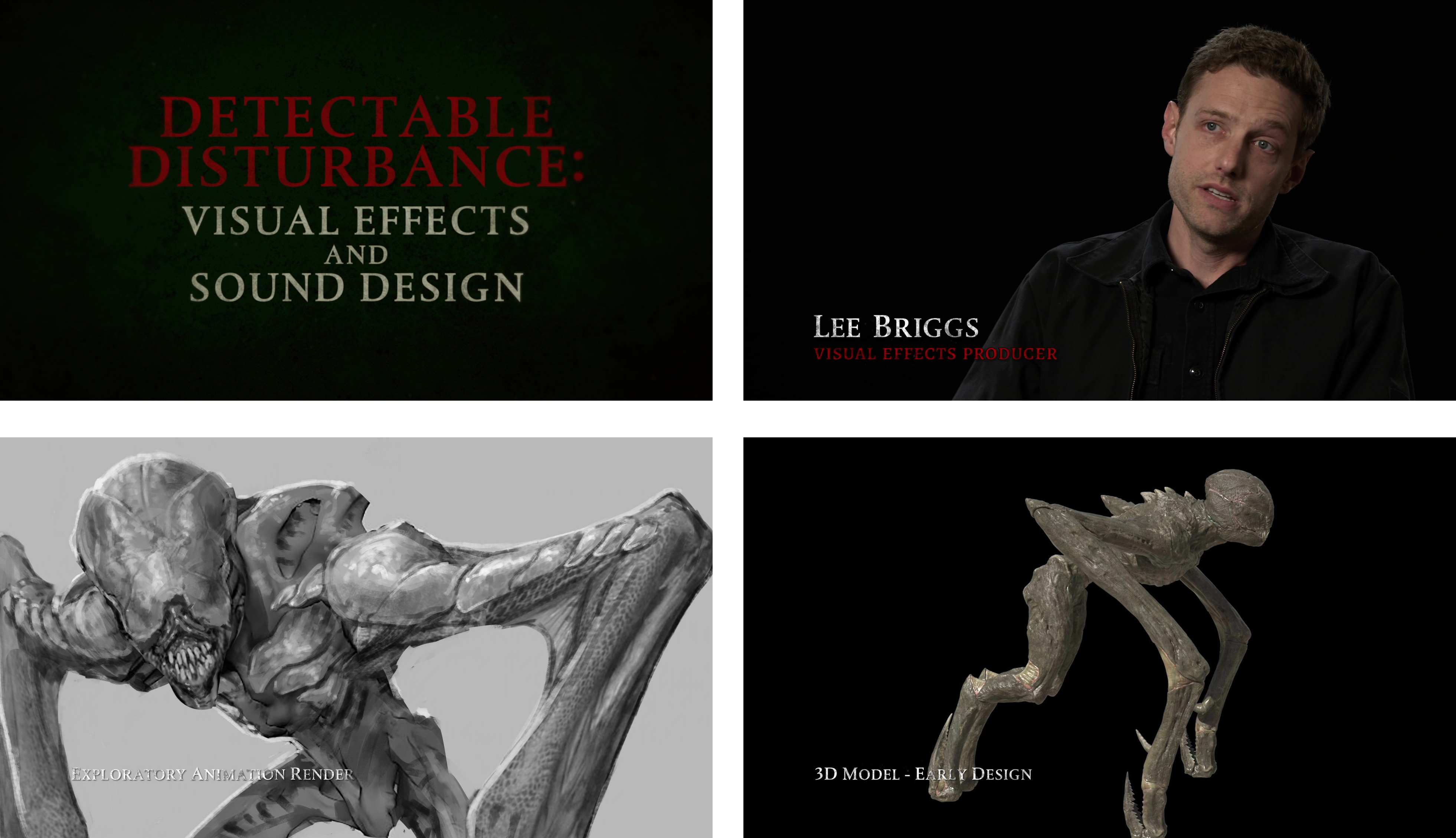 마지막으로 ‘Detectable Disturbance: Visual Effects And Sound Design’는 영화의 시각효과와 사운드 디자인에 대한 영상이다. 잘 알려진 것처럼 이 영화의 특수효과는 ILM이 맡았다. 1편을 제작할 당시 감독이 생각한 특수효과의 모토는 “모든 걸 리얼하게 표현하자” 였는데, 크리처 디자인도 화려함을 버리고 최대한 사실적 진화에 기초해 디자인 했다고 한다. 속편에서는 외형에 변화를 주는 대신 걷고 뛰는 기존 사이클에 변화를 줘서 보다 다양한 무브먼트를 보여주는 것에 집중했다.