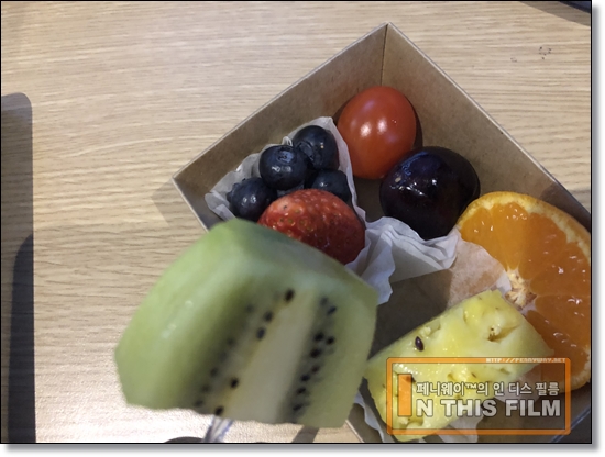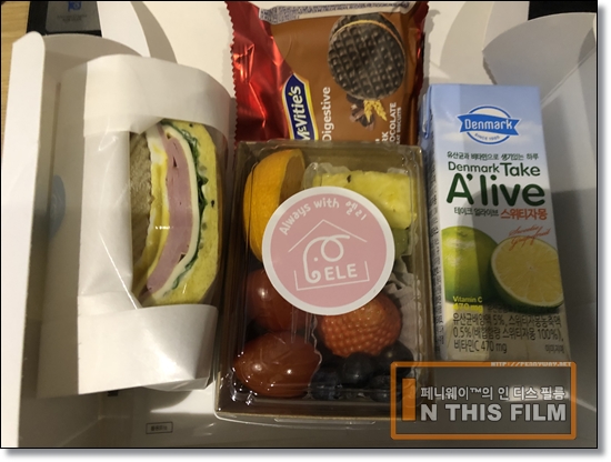 아침은 샌드위치나 샐러드빵 같은 메뉴에 과일과 음료, 간단한 주전부리류가 곁들여진 스타일의 조식으로 세 끼 중에서 가장 맘에 드는 구성이다. 특히 과일 같은 경우는 상큼한 게 먹고 싶던 격리 이틀째 정말 반가운 메뉴였는데, 아침에만 지급되는 지라 가급적 조금씩 먹고 냉장고에 보관하면서 세 끼를 나눠먹길 권한다. 중식과 석식에 야채가 거의 없기 때문에 저런 과일류가 특히 땡기게 된다.