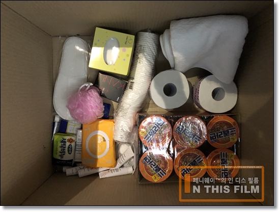 보급품으로는 수건 2장과 두루마리 화장지 2개, 각 티슈 한 통, 컵라면 6개와 카누 10개들이 1박스, 물티슈, 1회용 비닐장갑, 호텔에서 쓰이는 각종 어메니티, 샤워볼, 욕실 슬리퍼, 1회용 종이컵 다발, 세탁비누 등이 들어 있다. 이 만하면 10일 정도는 충분히 버틸 수 있다. 와이프가 그 정신없는 와중에도 바리바리 싸 준 것들이 있지만 사실 필요한 건 대부분 국가에서 지급이 된다.