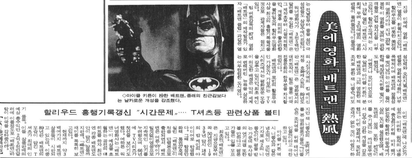이러한 [배트맨]의 놀라운 흥행 소식은 한국에서도 꽤나 화제가 되었는데요, 직배사 시절임에도 불구하고 [배트맨]은 북미개봉 시기보다 다소 늦은 1990년의 여름방학 시즌에 개봉되었고, 20만 관객 동원에 그치며 흥행에 실패하고 맙니다. 정말 의외였던 상황이죠. 물론 1990년 여름시즌에 워낙 많은 외화들이 치열한 흥행 전쟁을 벌이긴 했습니다만 북미 박스오피스 1위작의 실패는 관계자들도 꽤나 당황스러웠다고 해요. 이후로 한국 시장에서 [배트맨]은 통하지 않는다는 이상한 징크스도 생겼고 말이죠. (물론 이는 [다크나이트]로 어느 정도 깨지긴 합니다만...)