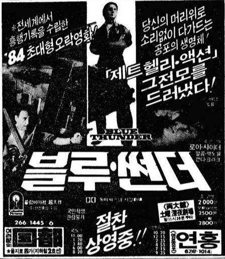 국내에서는 1984년 연흥극장과 국도극장에서 동시개봉했는데, 사실 이 작품은 안타깝게도 “국민학생 관람불가”등급을 받아서 원칙적으로는 국딩 아이들이 볼 수가 없던 작품이었죠. 그럼에도 동네 동시상영관이나 비디오 테잎, 유선방송 등을 통해 암암리에 이 작품을 봤던 아이들은 자랑스럽게 자신들이 봤던 블루썬더의 활약상을 마치 영화를 보듯 드라마틱하게 설명해주곤 했던 기억이 납니다. 당시 아이들은 마징가 vs. 태권브이 마냥 에어울프 vs. 블루썬더에 대한 논쟁도 즐겨했던....