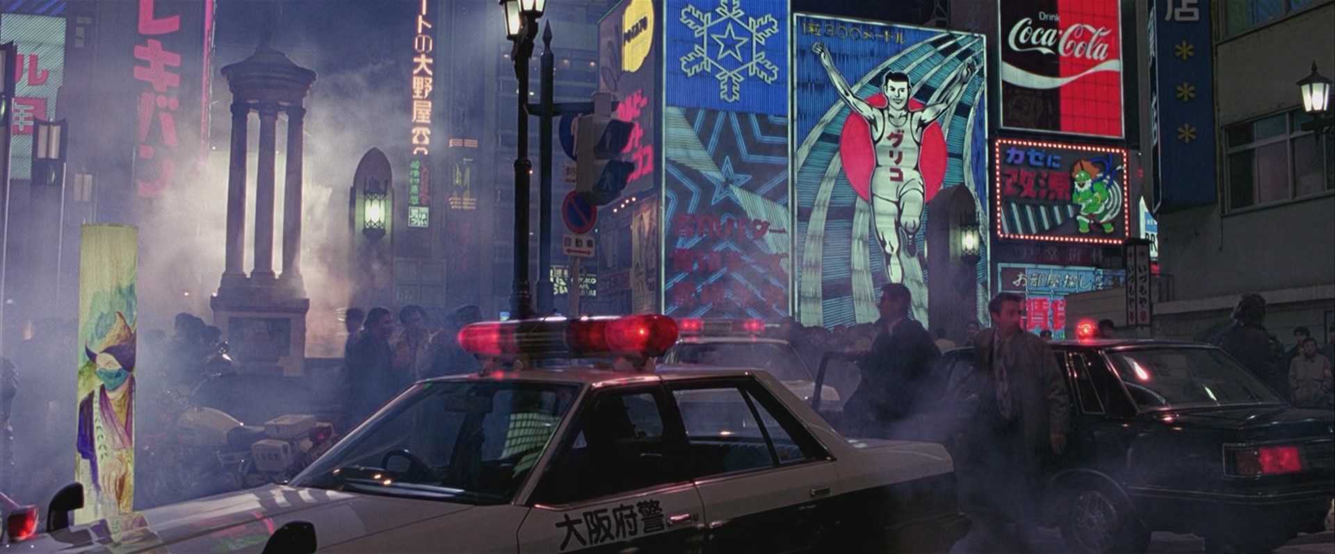 영화 [블랙 레인]의 한 장면. 차에서 내리는 앤디 가르시아와 마이클 더글라스, 다카쿠라 켄의 뒤로 그 유명한 글리코 사인이 보인다.