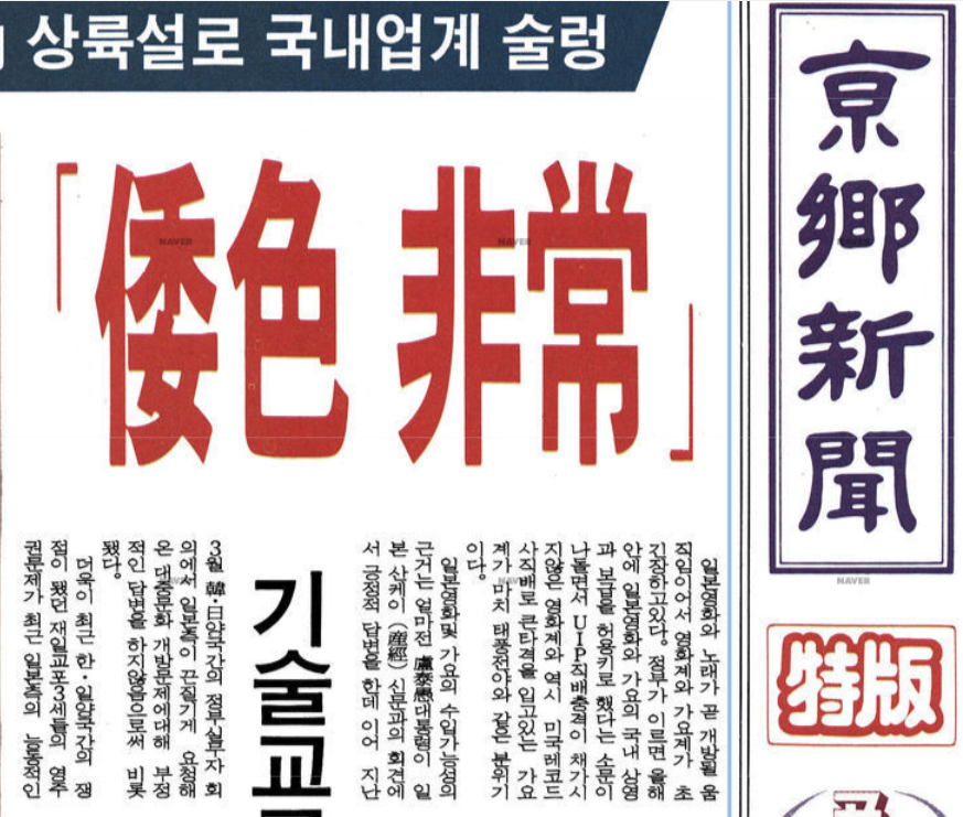 1990.04.06. 경향신문의 1면 기사. 고작 [블랙레인]과 홍콩·일본합작액션영화 2,3편이 수입되었을 뿐인데도 무려 [왜색비상]이라는 선정적인 헤드라인으로 호들갑을 떨고 있다.