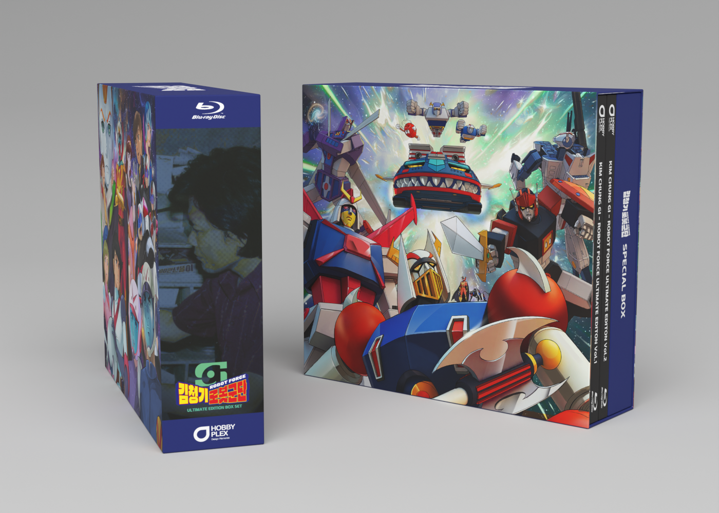 이번에 출시될 [김청기 로봇군단] 블루레이는 하비플렉스에서 출시한 [로보트 태권브이] UE, [외계에서 온 우뢰매] UE 와의 통일성을 강조한 패키지가 눈에 띈다. 박스셋의 본편은 [황금날개 123], [혹성로보트 썬더A], [초합금 로보트 쏠라 123]를 수록한 Vol.1, [스페이스 간담V], [로보트 군단과 메카3], [똘이와 제타로보트]를 수록한 Vol.2의 디지팩 두 개로 이루어져 있다.